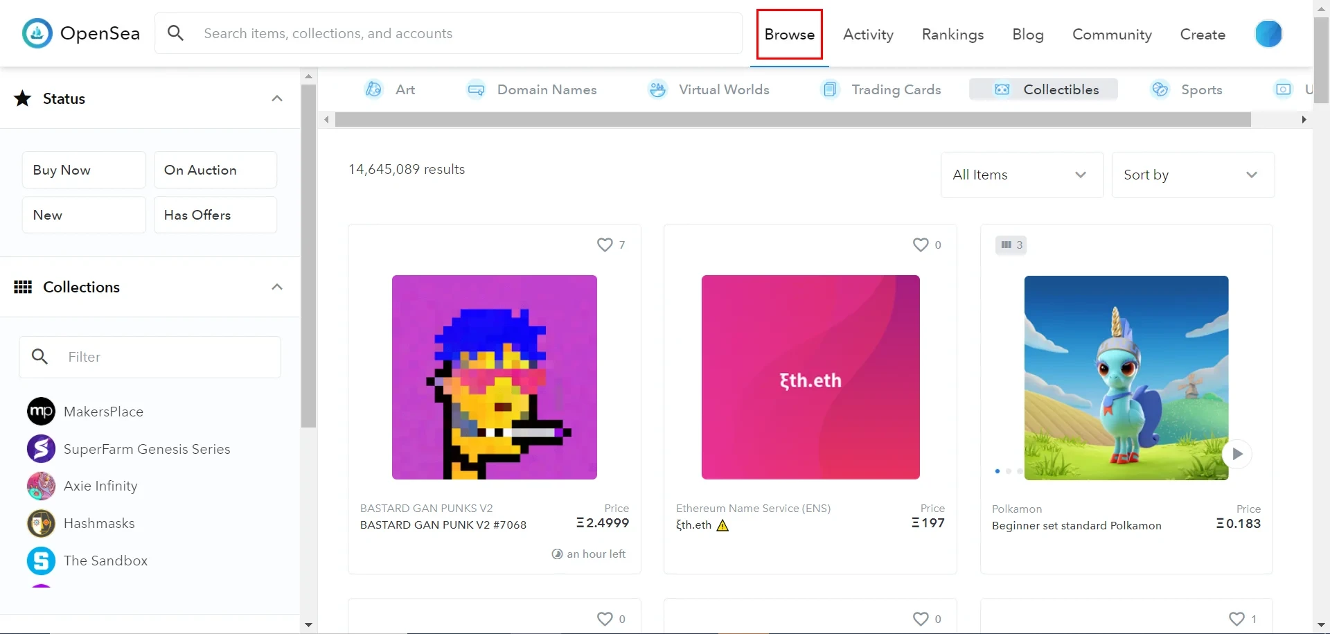 进入OpenSea官网,链接好以太坊钱包后,点击上方“浏览”便可开始选购商品。