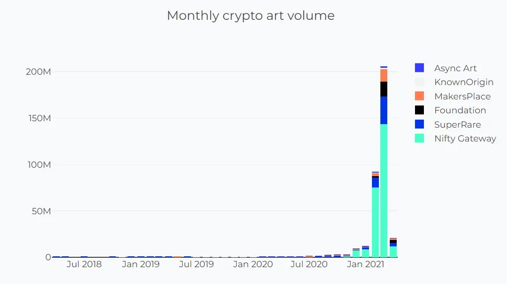 拍出天价艺术品带来的“出圈效应”是NFT市场的蓬勃发展。Crypto Art官网数据显示,当前加密艺术的总价值已经达到了4.96亿美元,共售出172,880,其中3月售出的加密艺术价值就超过了2亿美元,较2月实现了翻番。下图可见,加密艺术市场在2021年2月之后出现明显的激增。