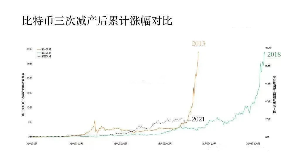 综合上面的分析,我们可以看出,牛市已经到了后期阶段。而从比特币牛市每一阶段的走势和持续时间可以看出,牛市进行的阶段越靠后,涨幅越大,但持续的时间却相对越短。从牛市的进行时间条看,现在的牛市也许只剩下不到半年时间,但是这后30%左右的时间,所可得的收益可能占整个牛市的60%以上。参考比特币前两次减半的牛市,“所有牛市前期看起来巨大的涨幅,在牛市后期疯狂飙升面前,都会成为一条直线”。