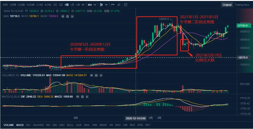 如果把去年”5.12比特币减半”算作此轮减半行情的开始,那么现在已经过去一年又五个月。我们知道,比特币体量越大,波动性越低,上涨速度会越慢,牛市持续时间会越长。因此,我们在用历史对比的方法来判断牛市处在什么阶段时,需要从整体上考虑此轮牛市处在什么阶段?再用技术分析的相关理论来具体分析牛市此时的位置。得出自己的结论之后,就可以据此来制定自己的投资策略。
