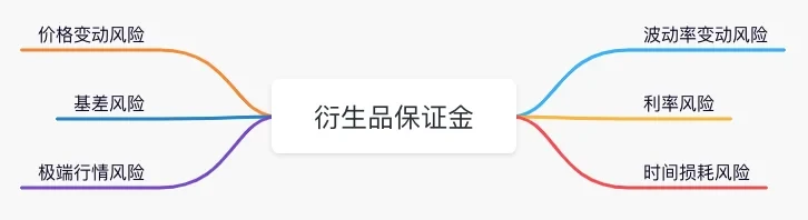 衍生品保证金对应的风险 = max{ [max(价格变动风险,极端行情风险,时间损耗风险) +基差风险 + 波动率变动风险 + 利率风险], 爆仓惩罚费+手续费+交易滑点} 。