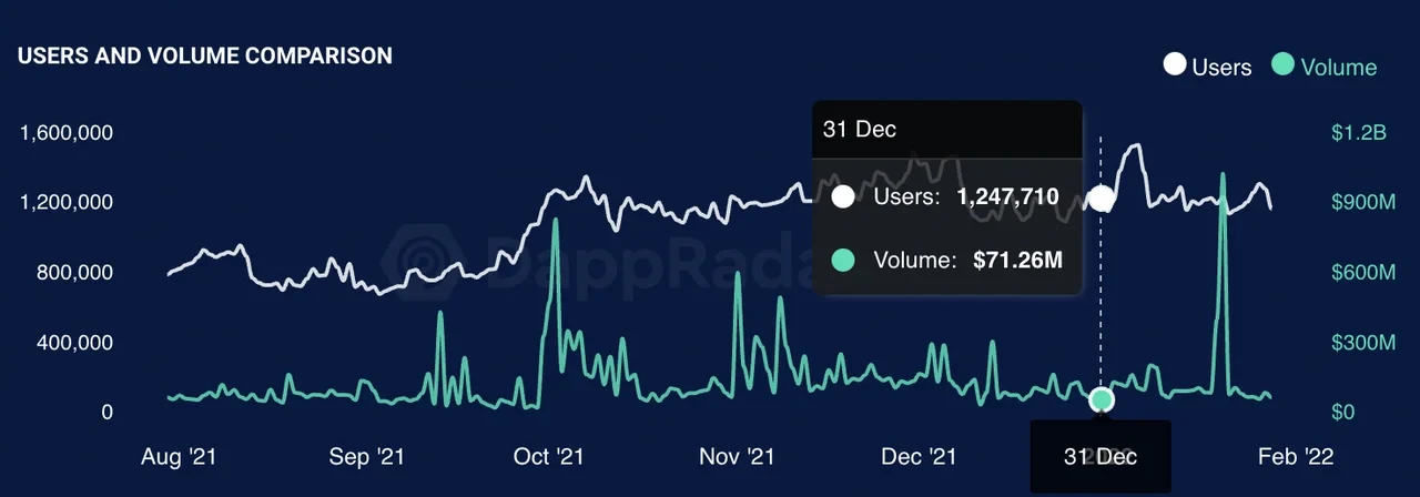 DappRadar数据显示,全网累计已有 1334 个游戏类 Dapp上线部署。从 2021年 7 月以来,链游数据迅猛增长,玩家从 4 月初的 8 万人增长到 12月的 124.8 万人,日交易量从 4 月初的 50 万美元左右增长到均值在 2亿 美元左右的水平,最高日交易量超过了8.5 亿美元。