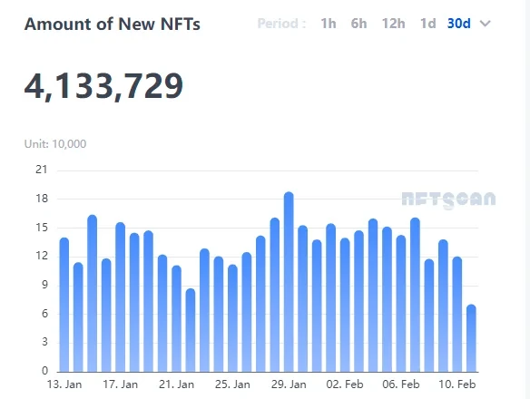 2022年开年之后,NFT市场延续了此前的增长势头。据Forkast报道,NFT独立买家数量在1月超过了89.5万名,创下历史新高,同比增长3,000%。而据NFTScan数据显示:以太坊网络近30天新增NFT资产数超413.4万枚。