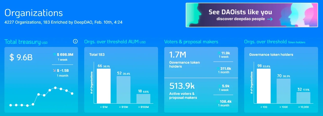 2021是DAO快速发展的一年,生态初具规模,并展现出了作为一种新型合作方式的无限潜力。据数据统计,截止到2022年1月,业内共有超4200个DAO 组织,覆盖投资型、应用型、治理型三大方向,涵盖开发工具、服务、社交、创造、收藏等多个领域。而DeepDao网站统计的183个DAO,资金规模更是超过96亿美金。组织成员和代币持有者的累计数量达170万人,近一个月内增长超22.3%。