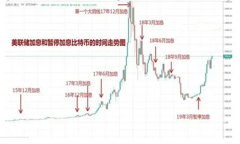 如下图所示,有研究者将历史上比特币价格表现与美联储加息时间进行了对应,发现加息往往对应比特币价格下降。