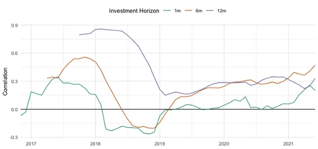 比特币也在经历通货膨胀,并从中获得了许多收益。由于比特币等部分数字资产存在供应上限,因此有观点认为这类数字资产可以成为通货膨胀的对冲工具。到目前为止,支持这种说法的历史数据非常有限,有研究者发现,比特币和CPI在短期和长期投资范围内的相关性具有中到强的正相关关系(如下图所示),且比特币和CPI之间的相关性在不同的投资范围内表现出随时间变化的特性。