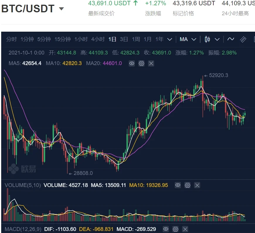 价格方面,比特币在7月21日下探3万美元确认获得支撑之后,便一路开始反弹行情,月线连收两根阳线,最高达到5.29万美元,最高涨幅为82.4%,不过强势势头在九月初遭到了一定的阻力,最终在九月以阴线收场,收盘价定格在4.3万美元。