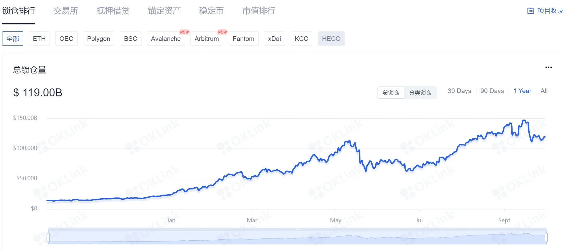 据OKLink统计,在今年第三季度,DeFi锁仓资产总价值成功走出了5月以来的低迷区间,并在9月16日成功创下1468.9亿美元的新纪录。做一个或许并不恰当的对比,反观比特币和以太坊在第三季度的反弹行情,虽然可圈可点,但是都未能突破各自在第二季度创下的记录。对比之下,我们大致能够发现,当前加密市场上,DeFi对投资者资金的吸引力相比比特币等其他数字资产是有一定优势的。