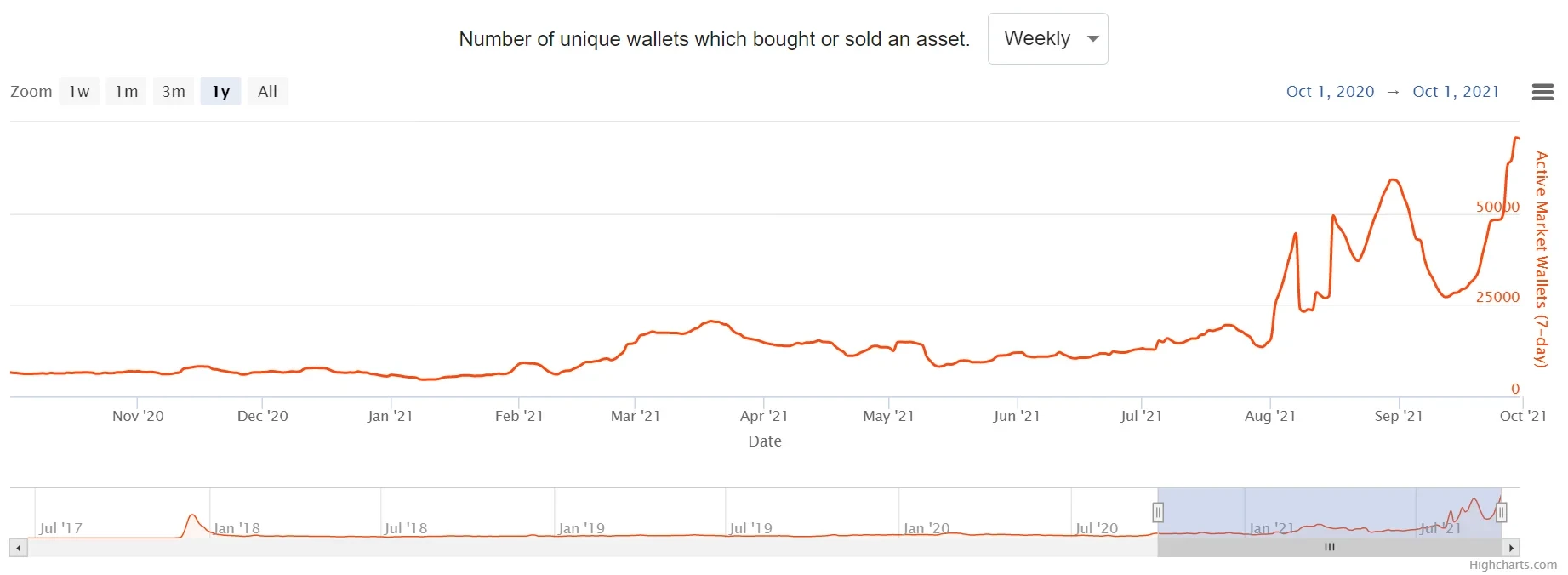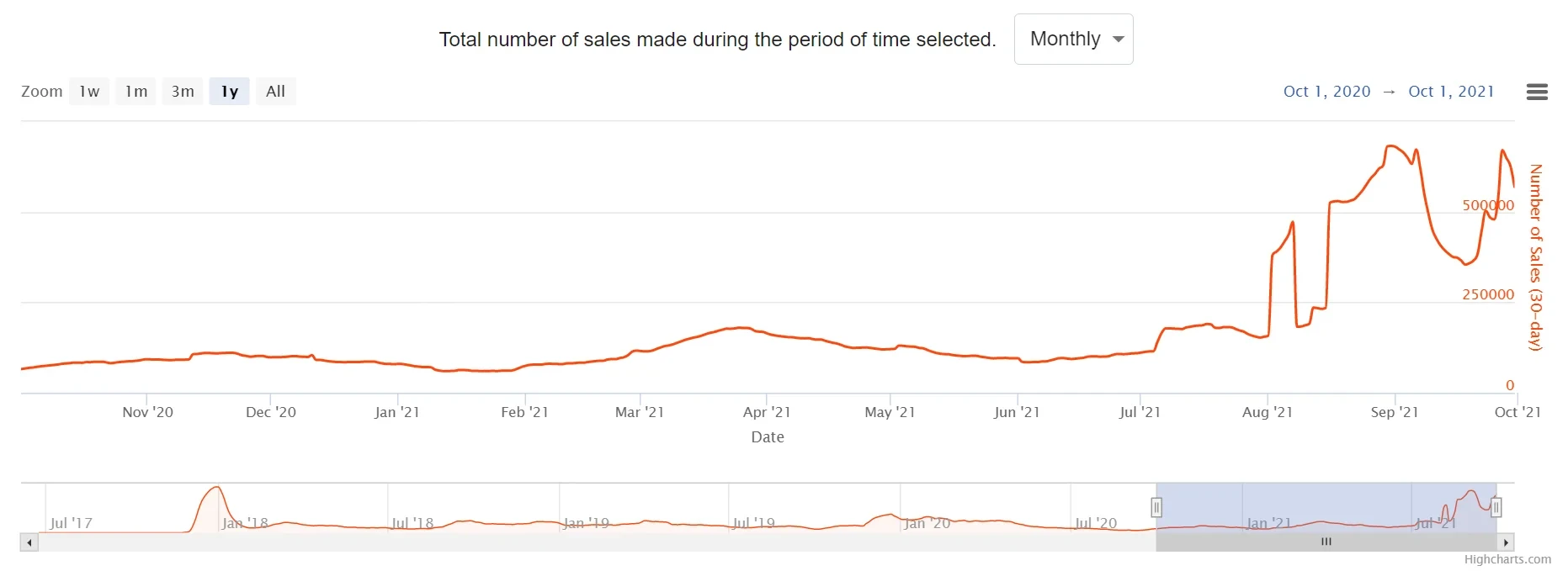 从上图可以看到,在7月1日当天,NFT市场的交易次数仅有3.1万,但到了8月16日,这一数字便攀升至19.4万,一个半月间涨幅高达525.8%,其后虽然也有大幅下滑,但是很快便又收复了失地,9月30日当天,交易次数已经回到了18.5万次的历史高水平位置。