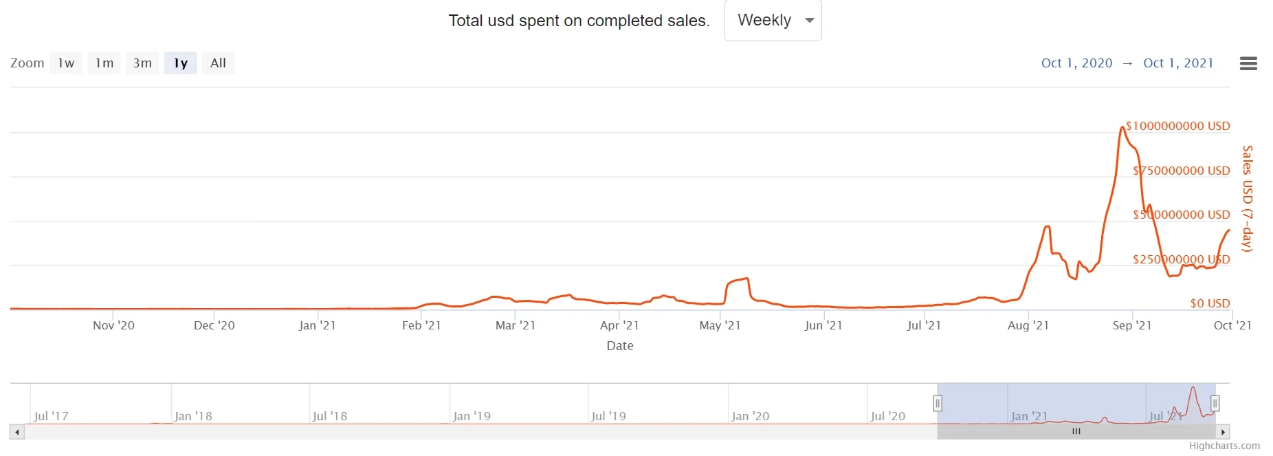 再放大到整个第三季度,根据nonfungible的数据,NFT市场的交易额自7月底开始快速飙升,从7月24日的4313万美元单日成交额,仅仅用了半个月时间,就创下了单日4.69亿美元的交易记录,涨幅接近10倍。