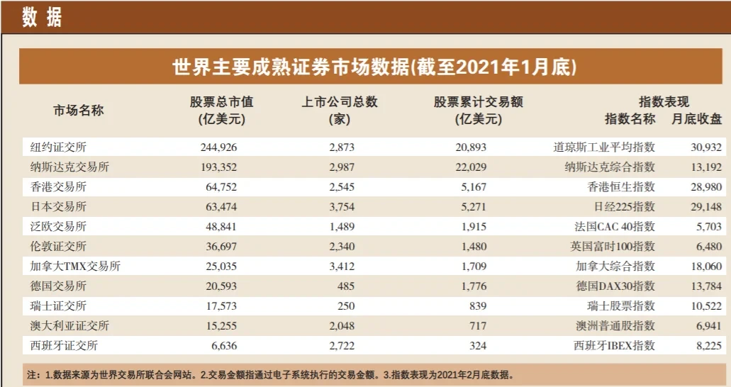 不过,就算是以1.97万亿美元的市值规模,放在当今国际金融市场上来横向对比,也依然是一个不容小觑的投资市场。要知道,作为当今世界上主要成熟证券市场之一的德国交易所,截至2021年1月底,其股票总市值也不过2.06万亿美元。