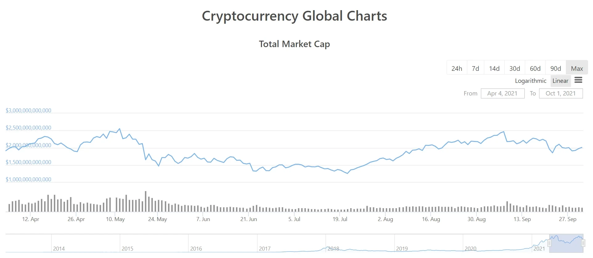 首先来从整体看一下加密市场在此期间的总市值变化,在经历了5·19极端行情之后,加密市场之后的两个多月时间里走过了一段低潮期。7月21日时,加密市场的总市值一度跌至1.25万亿美元,随后进入反弹上行周期,到了九月初达到了2.46万亿美元,距离5月12日创下的2.55万亿美元的历史前高进一步之遥,最终在九月底收于1.97万亿美元再度跌破2万亿美元大关。