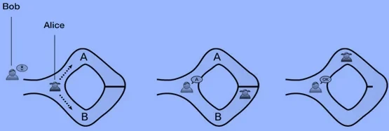 一个经典的例子:有一个缺口的环形长廊 ,出口和入口距离非常近(在目距之内),但走廊中间某处有一道只能用钥匙打开的门,Alice 要向 Bob 证明自己拥有该门的钥匙。采用零知识证明,则 Bob 看着 Alice 从入口进入走廊,然后又从出口走出走廊,这时Bob没有得到任何关于这个钥匙的信息,但是完全可以证明Alice拥有钥匙。