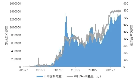图1. 以太坊网络日均交易笔数和Gas消耗量变化