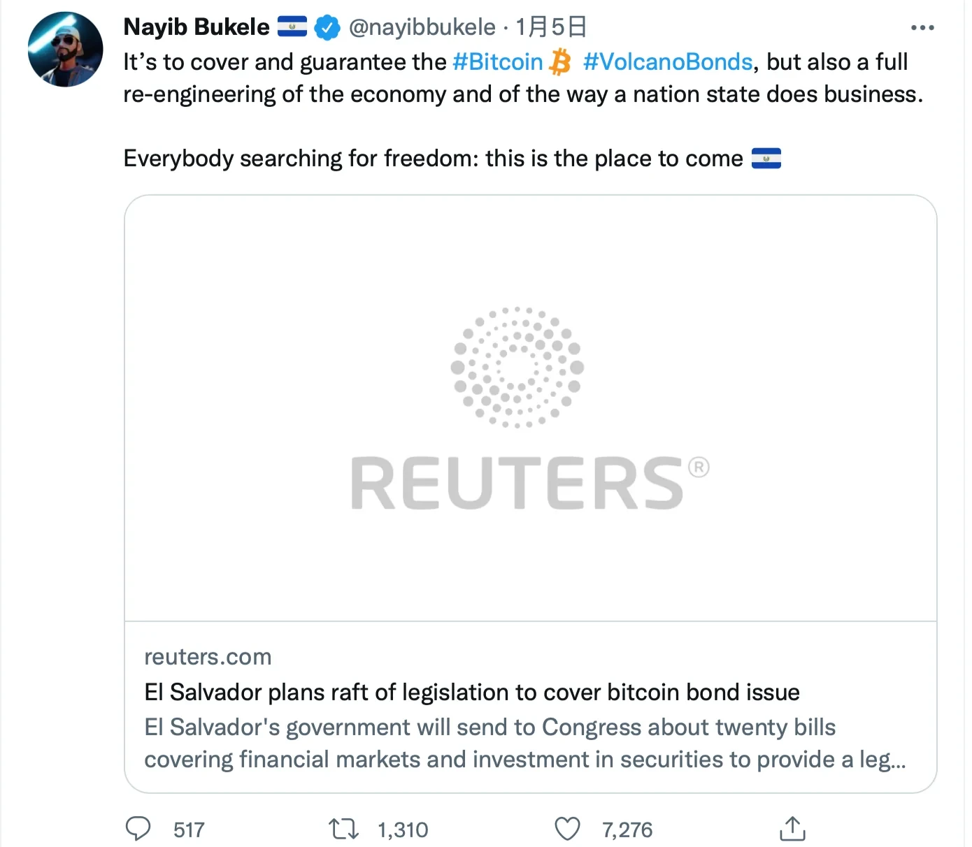 1月5日,萨尔瓦多财政部长宣布,该国政府将向国会提交大约20项涉及金融市场和证券投资的法案,来推进比特币债券的发行,法案将为每个购买比特币债券的人提供法律结构和法律确定性。随即,萨尔瓦多的总统纳伊布·布克勒(Nayib Bukele)也在推特上确认了这一事实,这一消息引起了大家的关注,也说明了此前萨尔瓦多宣布建立“比特币城”的计划并非噱头,而是在按部就班地推进。