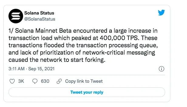 针对出现宕机的原因,Solana Status在其推特账号上的一份声明中说道,“Solana主网Beta 版交易负载大幅增加,达到 400,000TPS 的峰值。这些交易充斥着交易处理队列,缺乏对网络关键信息的优先排序,导致网络开始分叉。此次分叉导致内存消耗过多,一些节点下线。