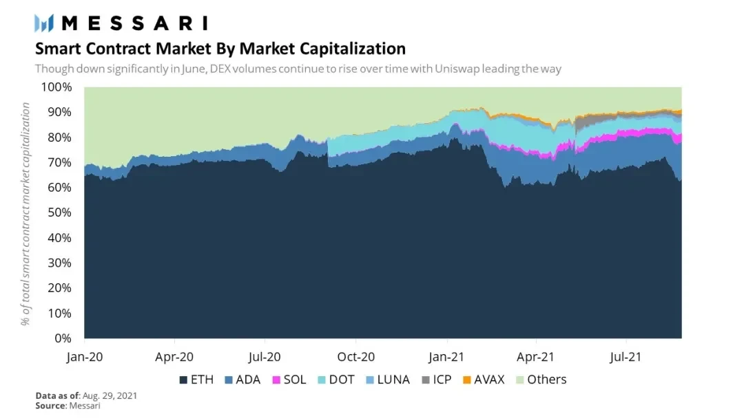 最后一个挑战则是以太坊的霸主地位。以太坊虽不是无法被其他公链超越,但确实在生态方面它具备相当的“垄断”优势。从去年至今年,DeFi和NFT的爆发更是使得以太坊获得了众多机构的关注与青睐。加密市场资金有限,其它公链的市场份额必然是一个此消彼长的状态,且中长期内仍然会受到以太坊的压制。即使像SOL这样的公链代币价格暴涨,但是其市值相对于以太坊来说,它们仍然只是一小部分。且不评价“以太坊杀手”这样的口号如何,公链竞争者们起码要先在生态应用、流动性、锁定资产量、交易数和活跃用户数等方面超越Layer 2,才有机会直面以太坊并挑战其地位。