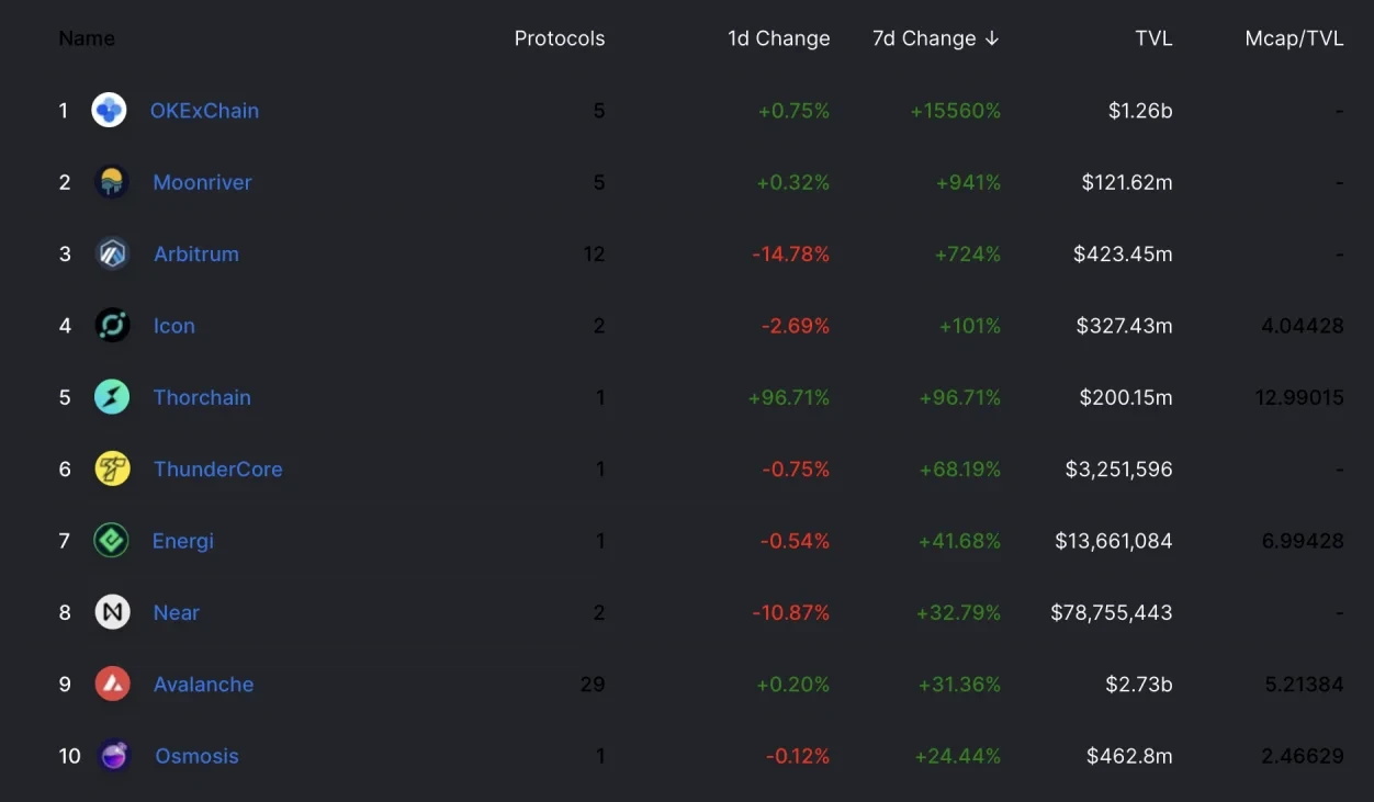 不可否认,今年以来DeFi市场大爆发,以及连续几波NFT热潮,确实给公链提供了更多的表现机会。众多公链开始迅速崛起并逐步构建起生态,也进一步推动了NFT和GameFi项目的火爆。根据DeFiLIama的数据显示,所有公链中近7天表现最为显眼之一是OKTC,近7天锁仓价值增长15,560%,截至9月17日链上TVL为12.6亿美元。OKTC当前链上总交易笔数32,748,725,持币地址数 1,116,525 , 当前TPS为20.8。