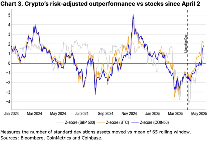 但问题在于,替代方案在哪里?当货币体系经历根本性变革、货币价值的基础被重新定义时,黄金以及近年来受到广泛关注的比特币等储值资产往往变得尤为重要。事实上,近几周,比特币“数字黄金”的定位日益清晰,特别是在风险调整后表现优于美股的背景下,其价值优势更加凸显。Coinbase资产管理公司在一份最新报告中指出,未来十年,全球储值资产市场可能将从当前的20万亿美元增长至53万亿美元,预计年均实际回报率(经通胀调整)可达6%。