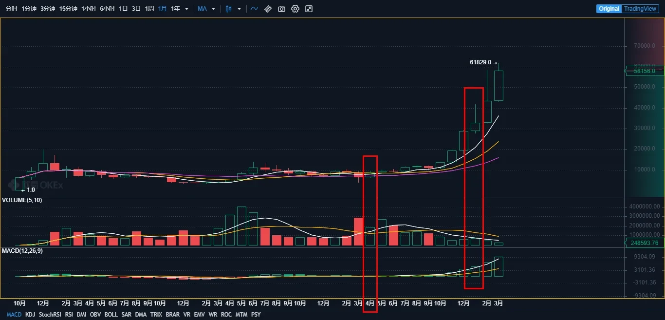 欧易OKX实时行情显示,比特币在2020年4月和2021年1月,分别收涨36.04%和14.17%。其中2021年1月因为拜登公布了1.9万亿美元的经济刺激法案后,市场在“大放水”的预期下,接力10-12月3个月月线级别阳线后,再收3个月阳线,月线级别实现6连阳。