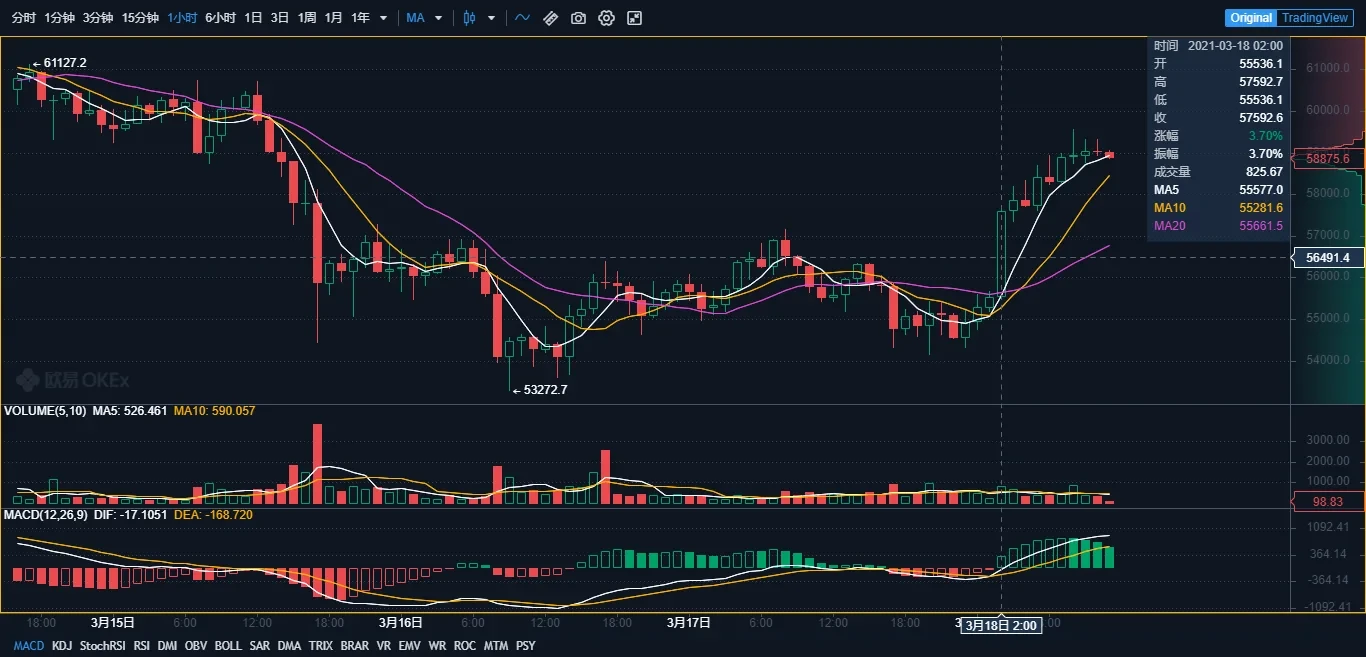 与此同时,黄金和比特币也是齐齐拉涨,黄金在凌晨2-3时,涨幅达1.15%。而比特币,据欧易OKX实时行情显示,以1小时级别来看,比特币于3月17日23时开始上涨,拉升迅速,截至3月18日上午11时,最高涨幅近10%。日线级别来看,比特币正处于接近历史高点的位置,如果上升行情得以延续,则日内很有可能再次挑战6万美元关口。