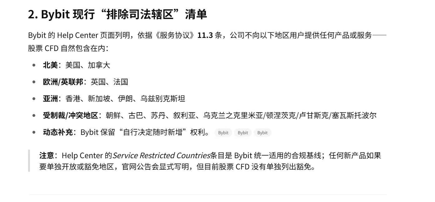 据公开信息,Bybit 目前已取得包括迪拜 VARA、塞浦路斯 CySEC、格鲁吉亚 VASP 牌照,此外,还获得哈萨克斯坦 AFSA 和阿联酋 SCA 的预批准许可,且正在法国推进 MiCA 相关申请,但已获牌照主要覆盖加密资产和差价合约领域,尚不构成对美国证券市场的合法准入。