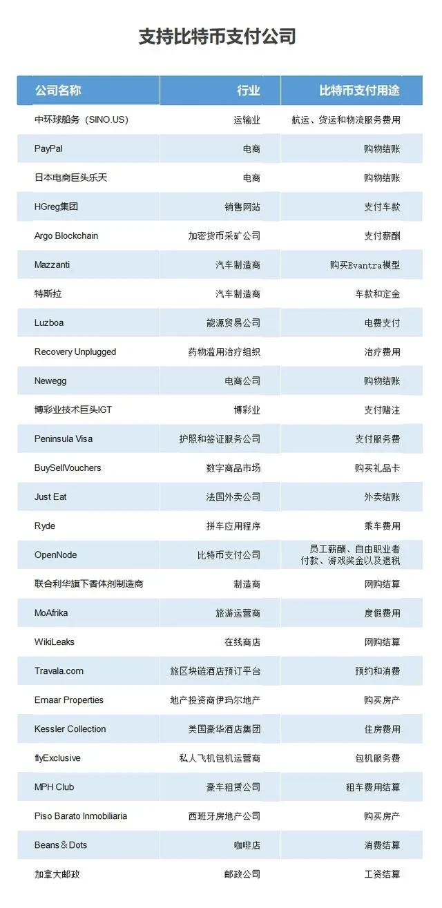 把时间再向前推,早在2014年,戴尔、微软等企业就已宣布支持比特币支付。在之后的几年时间里,游戏发行平台Steam、在线旅游巨头Expedia、美国最大的珠宝零售商之一Marks Jewelers、达美乐披萨、星巴克、NBA萨克拉门托国王队和NBA独行侠队等都先后宣布接受比特币支付。随着比特币价格的不断上涨,影响力越来越大,支持比特币支付的企业里,所涉及的行业也越来越广泛,据不完全统计,目前支持比特币支付的企业已达数百家之多。