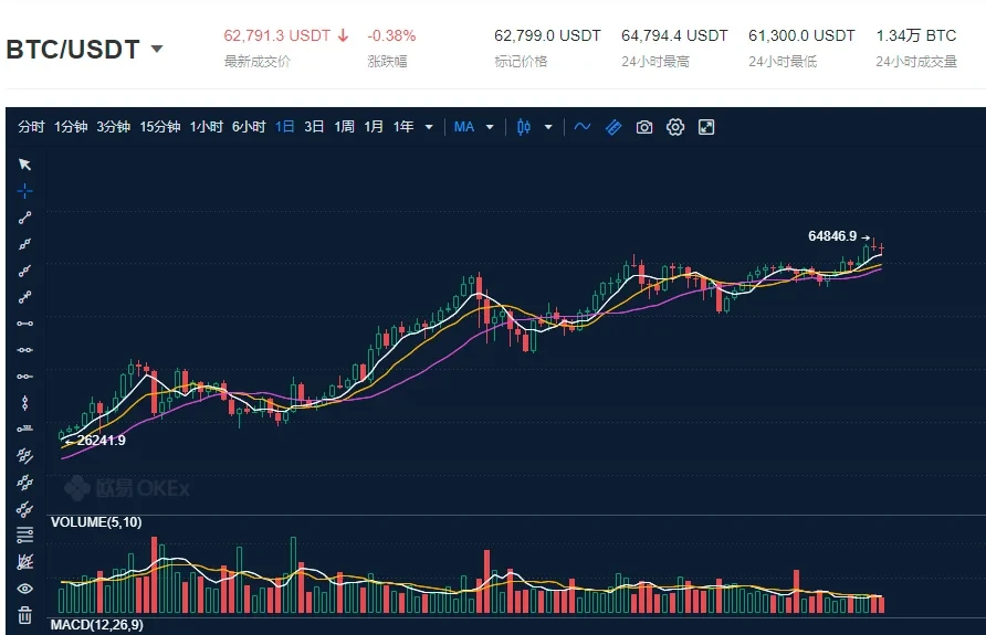 最显而易见的就是比特币价格的变化。如果从2010年5月那次10000个比特币购得价值25美元的披萨算起,到如今比特币的价格突破64000美元,比特币的价格已经飙升了2560万倍。虽然今天比特币的价格有所回落,但据欧易OKX行情显示,比特币依然维持在62000美元的高位,按照实时价格计算,比特币的总市值达到1.17万亿美元。