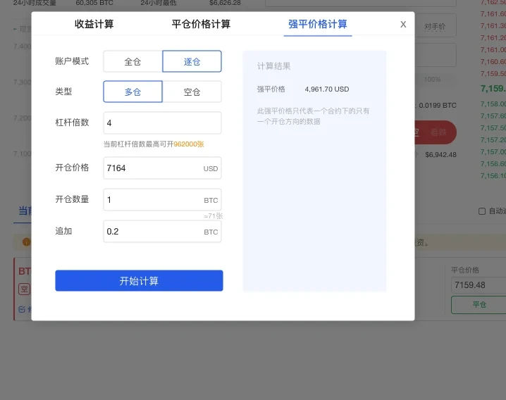 您需要选择您的合约类型:多仓或者空仓。再选择您的杠杆倍数。输入您的开仓价格,开仓数量和您追加的保证金金额。点击开始计算,您就可计算出您的预估强平价格。