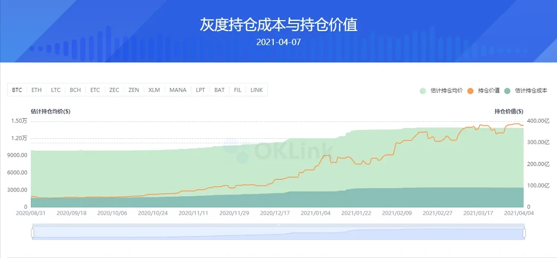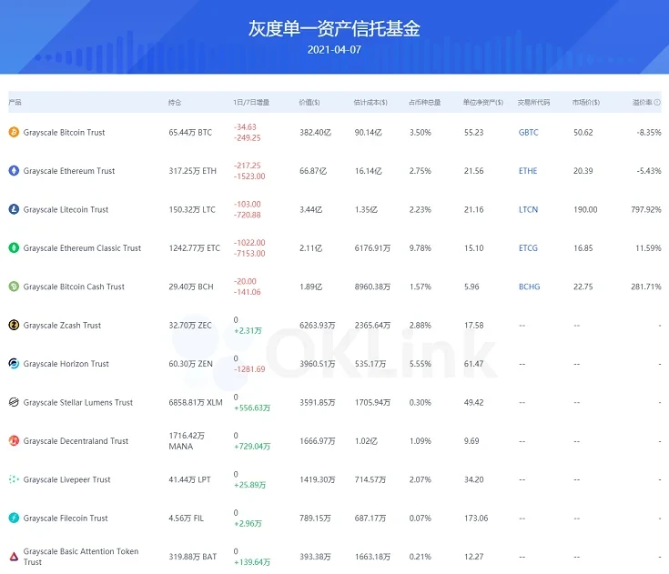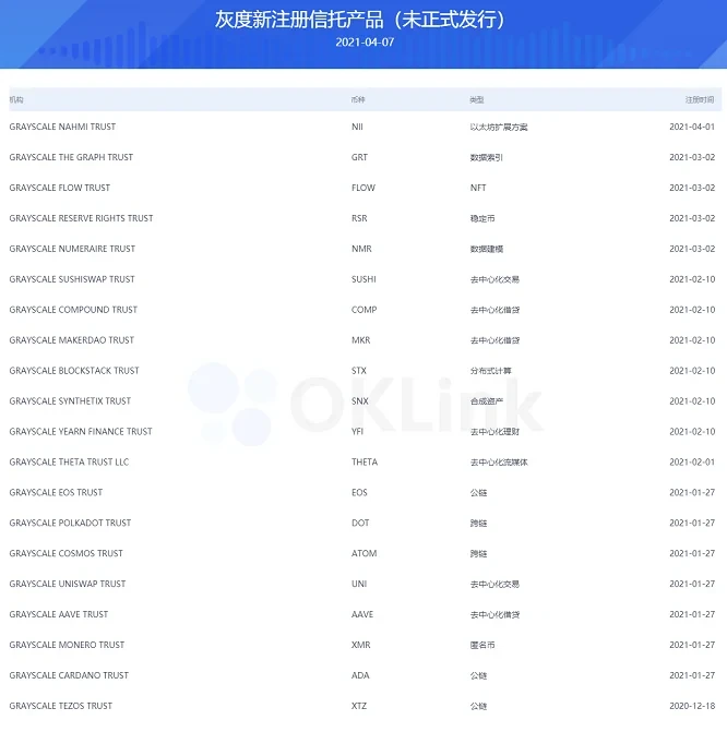 据OKlink网站统计,目前灰度投资已发行13支单一资产信托基金和一支包含主流币种的复合型基金,目前总价值458.56亿美元。