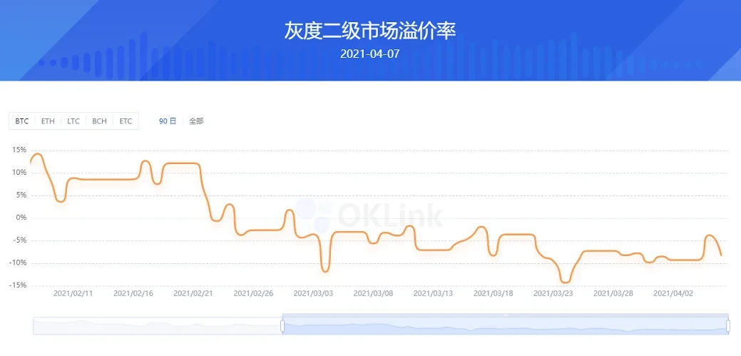 市值大幅增长的另一面,是近一个月来,GBTC在二级市场的溢价率持续在负数水平,特别是在今年的3月24日,溢价率一度达到-14.34%。关于出现负溢价的原因,最直接的解读就是二级市场的GBTC供过于求了,通俗点说,就是GBTC的吸引力没有那么大了。再进一步讲,是因为在灰度信托的模式里,套利机制无法有效运作,而市场是投机的,在这里讲投资信仰并不奏效,所以聪明的资金自然会去寻找更好的投资方式。