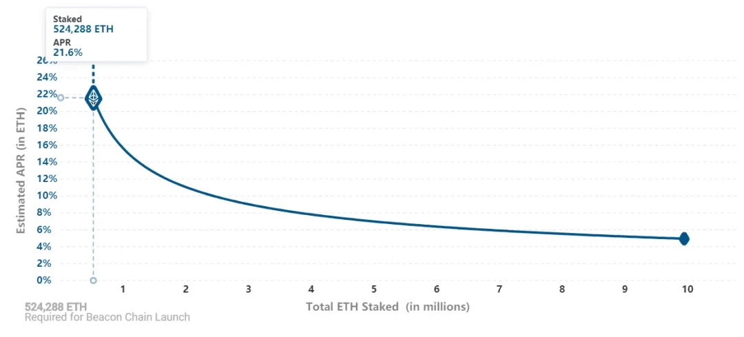 相较eth不同的是,beth可以参与挖矿,获得挖矿奖励。当全网eth质押达到524,288枚,启动主网时,矿工的年化收益率是21.6%。随着质押值的增大,年化收益率会随之下降。据曲线,当质押值达到1000万枚eth时,年化率可以维持在5%左右。