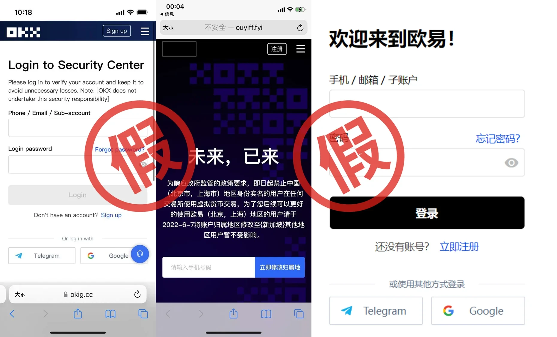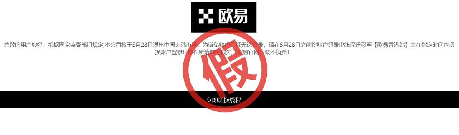 近期有不法分子通过短信、电话、IM等渠道联系用户,以“平台迁移”、“账户升级”、“清退用户”、“切换IP线程”、“修改账户归属地”等为由,引导用户进入虚假“欧易安全中心”,进而骗取用户账户信息和资产。