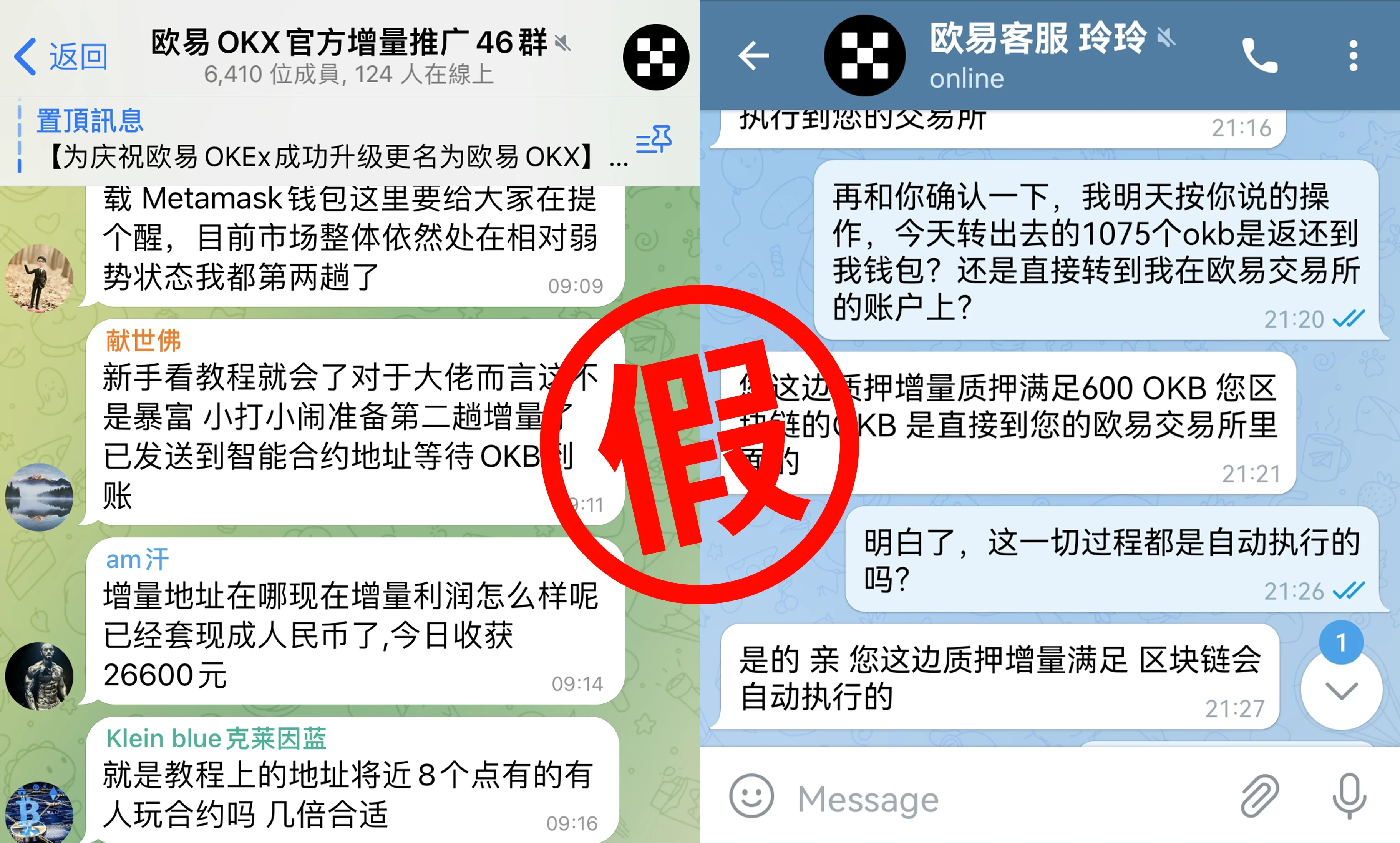 1、骗子假借与欧易官方合作名义,通过社交平台添加微信、QQ、Telegram账号等拉用户入群,以“搬砖套利”、“高额返利”、“带单操作”、“存币生息”等形式诱导用户投资,通过指导用户去指定平台交易等方式,直接转移或盗走资产。