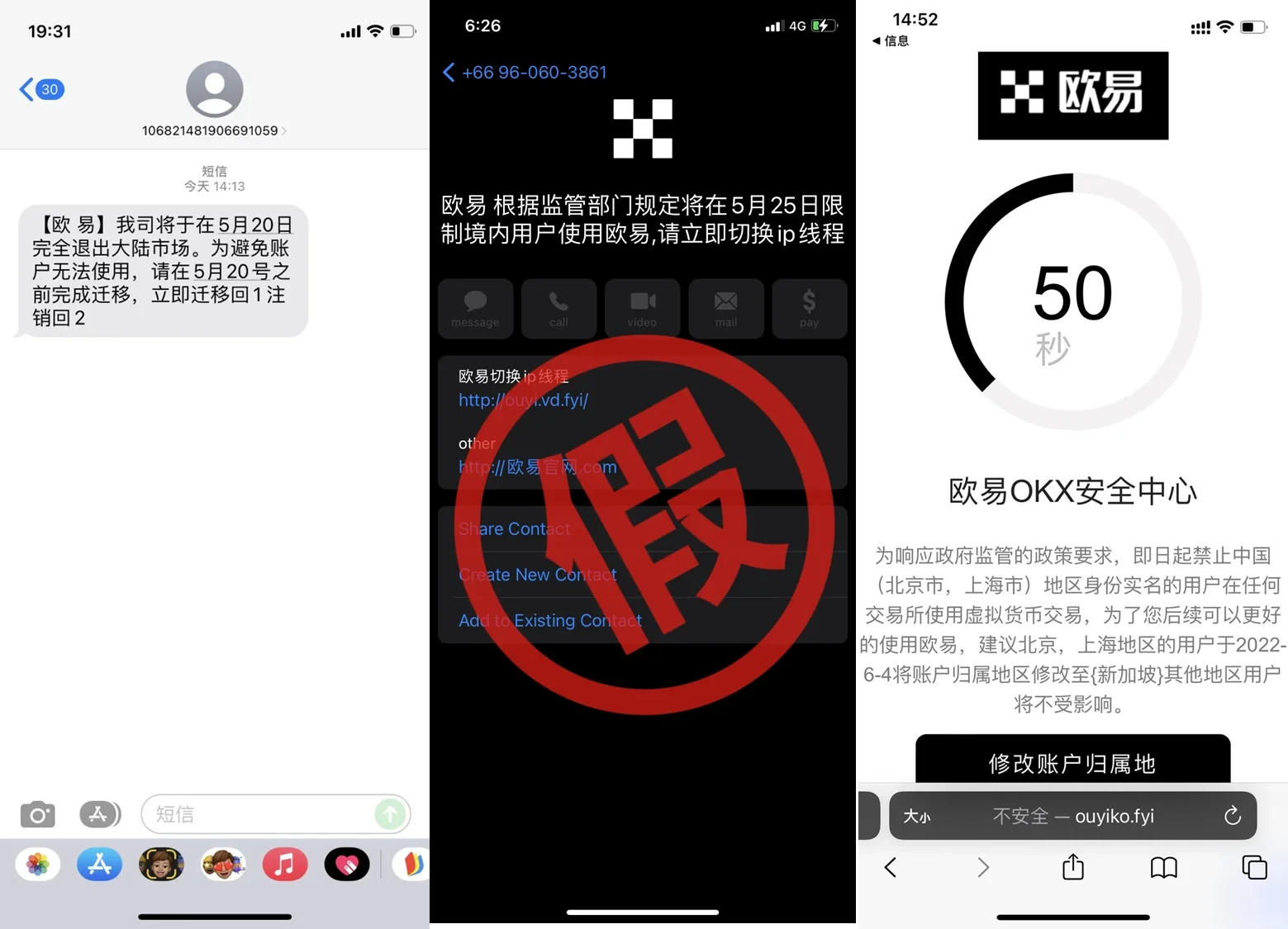 1、以欧易“平台迁移”、“账户升级”、“清退用户”、“切换IP线程”、“修改账户归属地”等为由,引导用户进入“欧易安全中心”。
