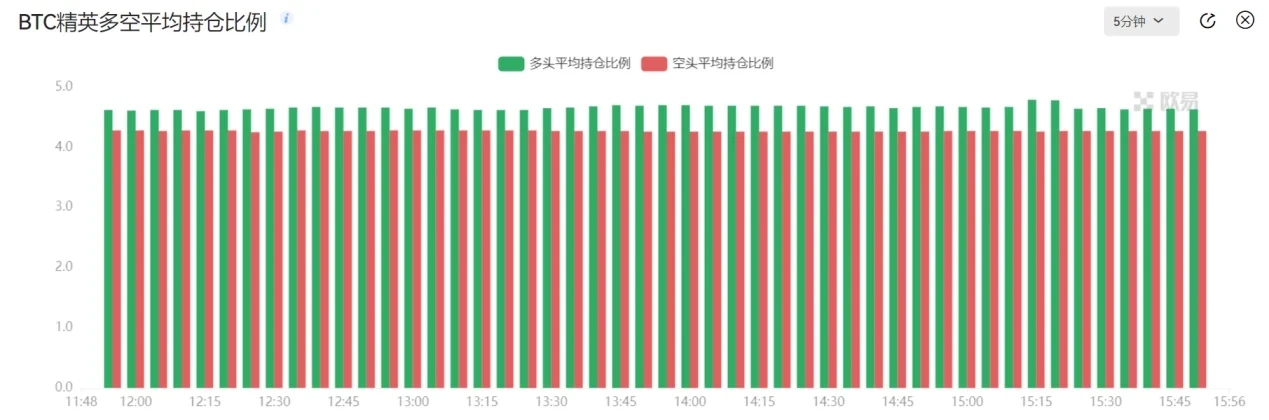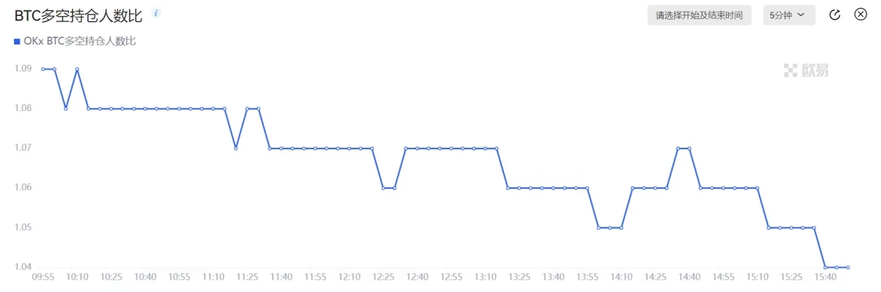4、多空持仓人数比:该指标展示某一时间内持有对应币种合约多仓总人数与空仓总人数的比值情况。统计数据包含本周、次周、当季及次季交割合约以及永续合约的情况总和。多空持仓人数比通常反映某时间段多空力量的博弈,代表的是投资者对后市的看法和市场情绪。比值越大,代表多方人数占主导,比值越小,则代表空方人数占主导。