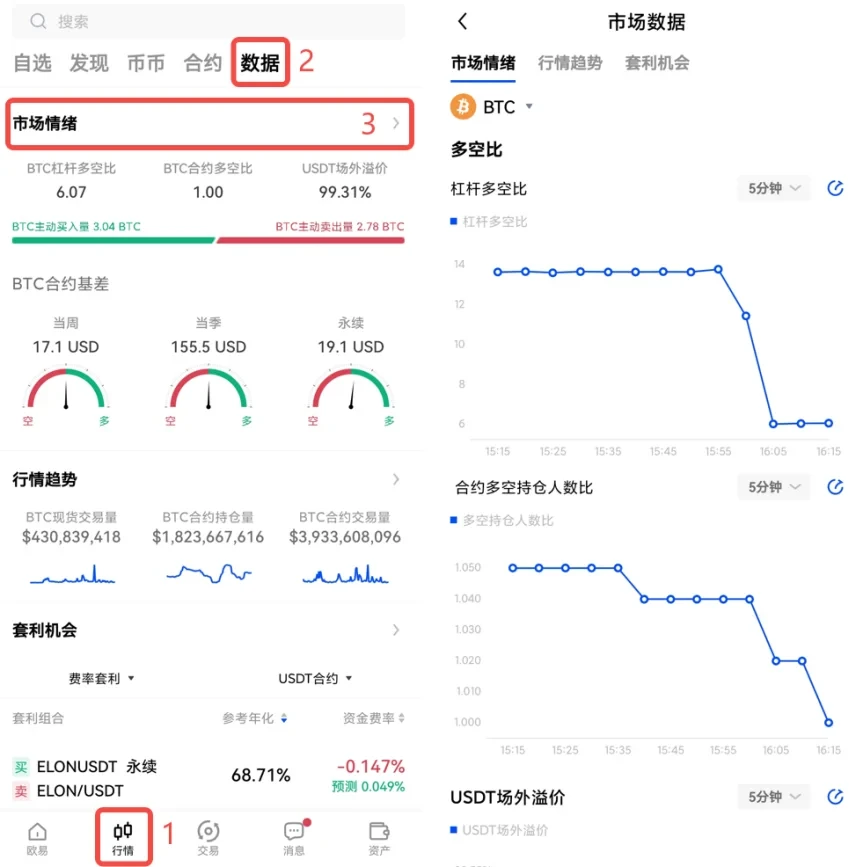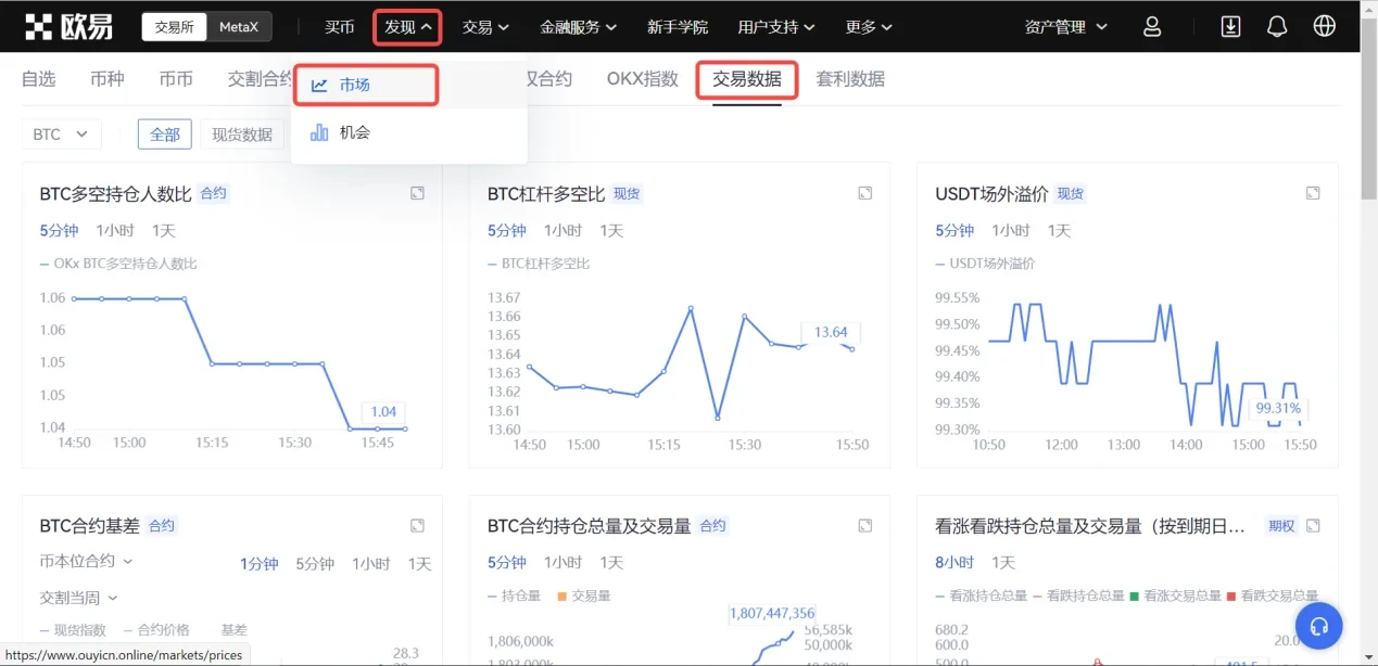 市场情绪指标包含BTC杠杆多空比、BTC合约多空比、USDT场外溢价、BTC合约基差等。您可以在欧易官网首页导航栏【行情】-【交易数据】,或APP【行情】界面的【数据】-【市场情绪】查看以上指标的实时数据。