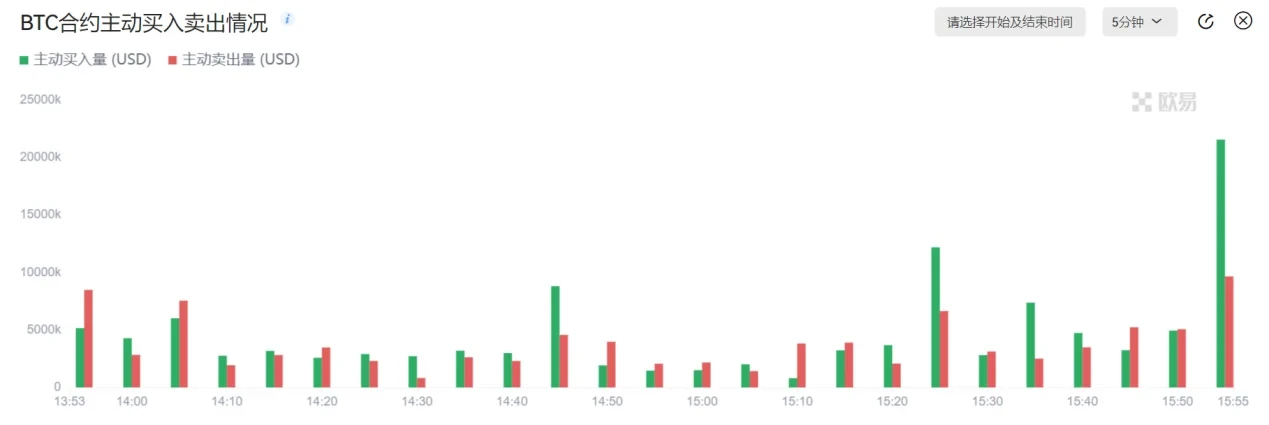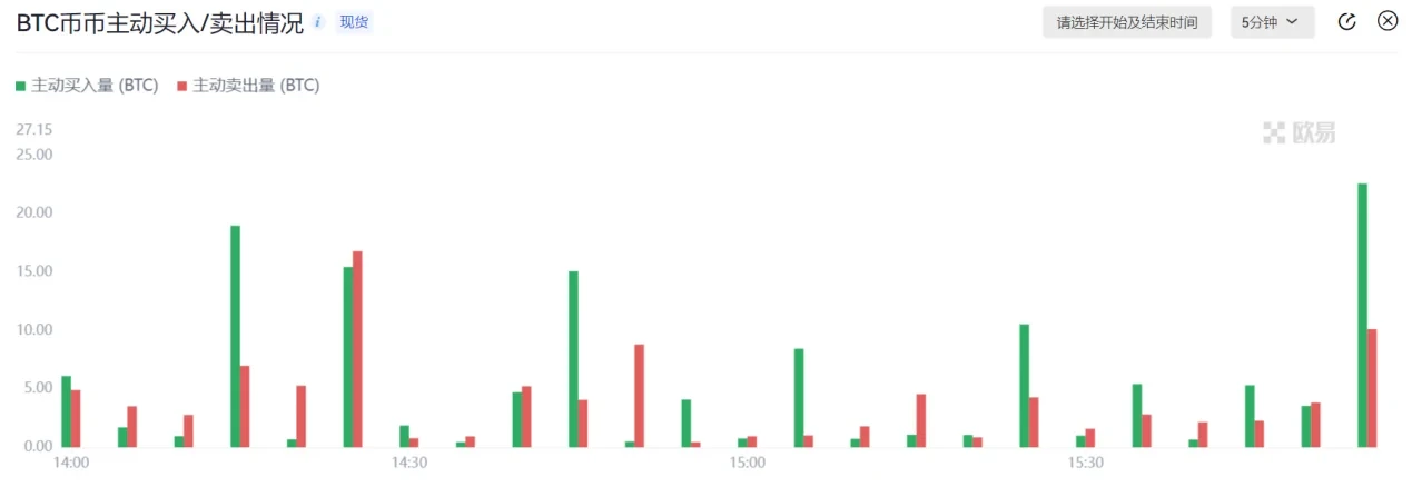 2、币币主动买入/卖出:主动买入量是在展示单位时间内,主动性买盘的成交量(taker吃挂单买入),即资金流入量。 主动卖出量是在展示单位时间内,主动性卖盘的成交量(taker吃挂单卖出),即资金流出量。通过主动买入量和主动卖出量的对比,可以反映某一时刻是买盘占主导还是卖盘占主导。