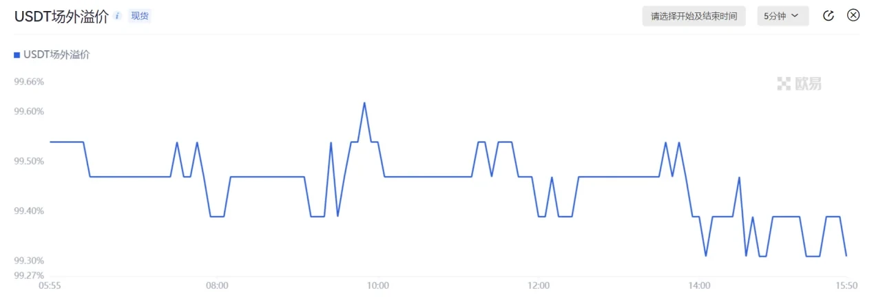 3、USDT场外溢价:该指标实时展示欧易法币交易区,USDT的场外溢价情况,即场外盘口价格与美元的比值情况。USDT场外溢价越接近100%,说明场外USDT价格与美元价值偏差越小。溢价分为正溢价与负溢价,溢价情况通常能够反映出USDT的场外需求,进一步反映交易所的出金和入金情况,对数字资产价格有一定的指示作用。