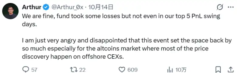 曾在上个周期凭借押注多个 DeFi 项目而风光无限的 DeFiance Capital 在本次崩盘事件中遭受损失。10 月 14 日,其创始人 Arthur 在社交媒体上发文表示,「我们没事,基金出现了一些亏损,但排不进我们前五大的盈亏波动日。我只是非常愤怒和失望,本次暴跌事件让整个加密领域大幅倒退,尤其是对山寨币市场而言,因为大部分价格发现过程都是在离岸 CEX 进行的。」
