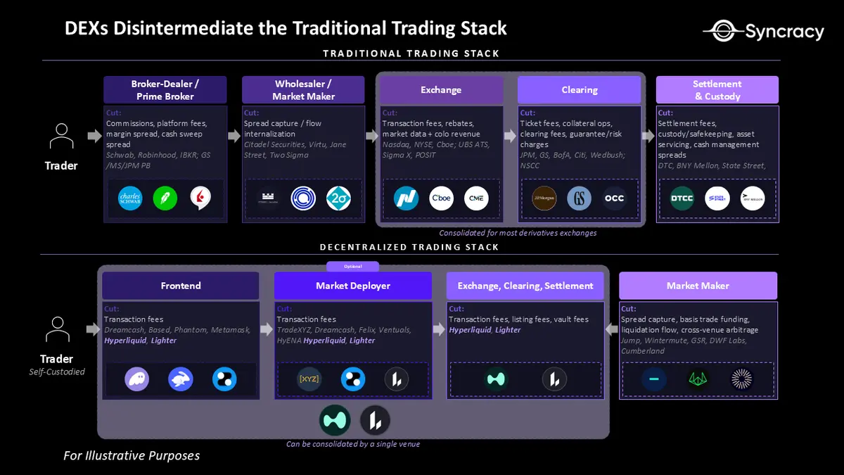 去中心化永续交易所不是将责任分配给多个中介机构,而是将大部分交易堆栈整合到一个具有原子保证金和结算功能的单一集成系统中。交易所本身执行了传统上由不同角色处理的许多功能:前端充当经纪人界面,智能合约实时管理清算和结算,API允许做市商在场所内与吃单者进行原生交互。换句话说,以前需要多层机构和内部操作系统才能完成的工作,现在可以由一个从不休眠的单一协议来协调。