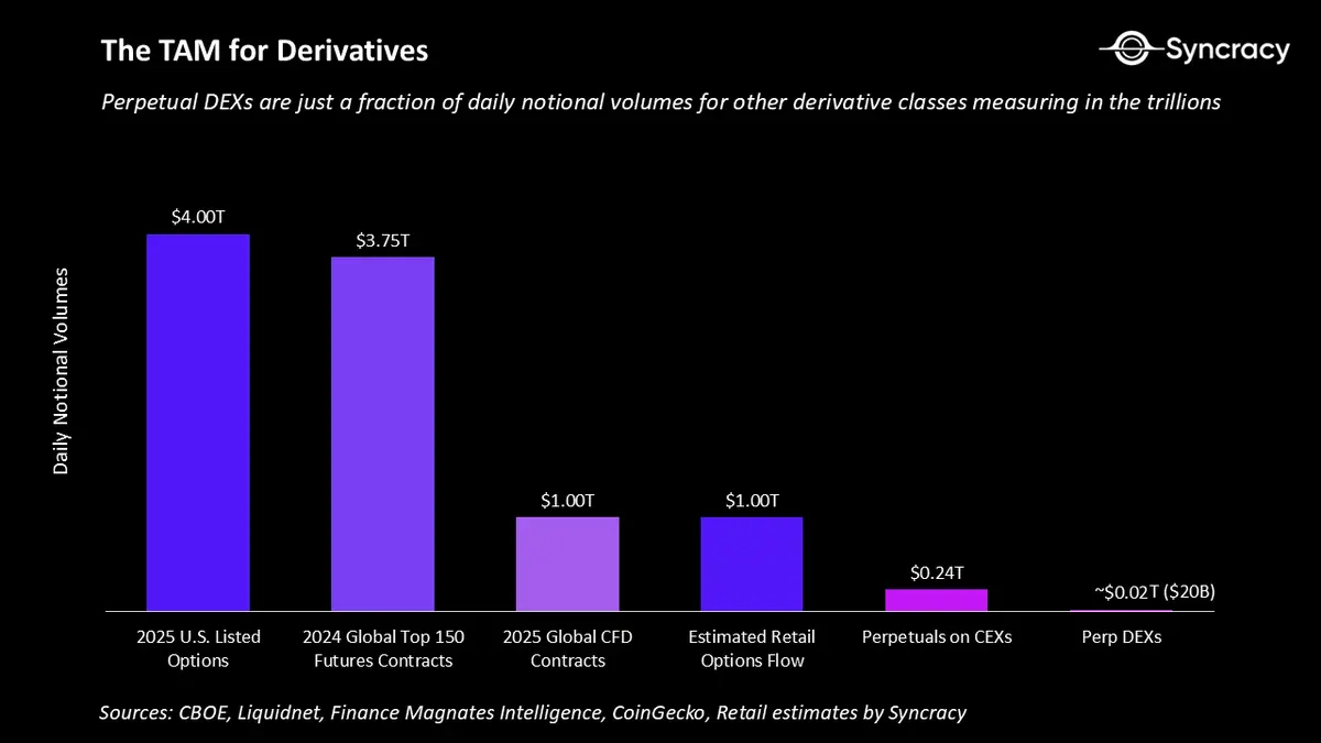 与更广泛的全球衍生品市场相比,它们基本微不足道。期权、期货和差价合约市场每天产生的名义交易量加起来超过8万亿美元,而永续DEX仅为200亿美元。