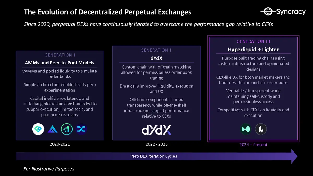 去中心化交易所的概念已经存在了十多年,承诺提供自托管、实时可审计、无需许可即可构建且全球可访问的交易所。然而,这些特性往往伴随着严重的性能妥协。早期的永续去中心化交易所面临吞吐量有限、延迟高、风险引擎简陋等问题,导致它们无法与中心化交易所竞争。
