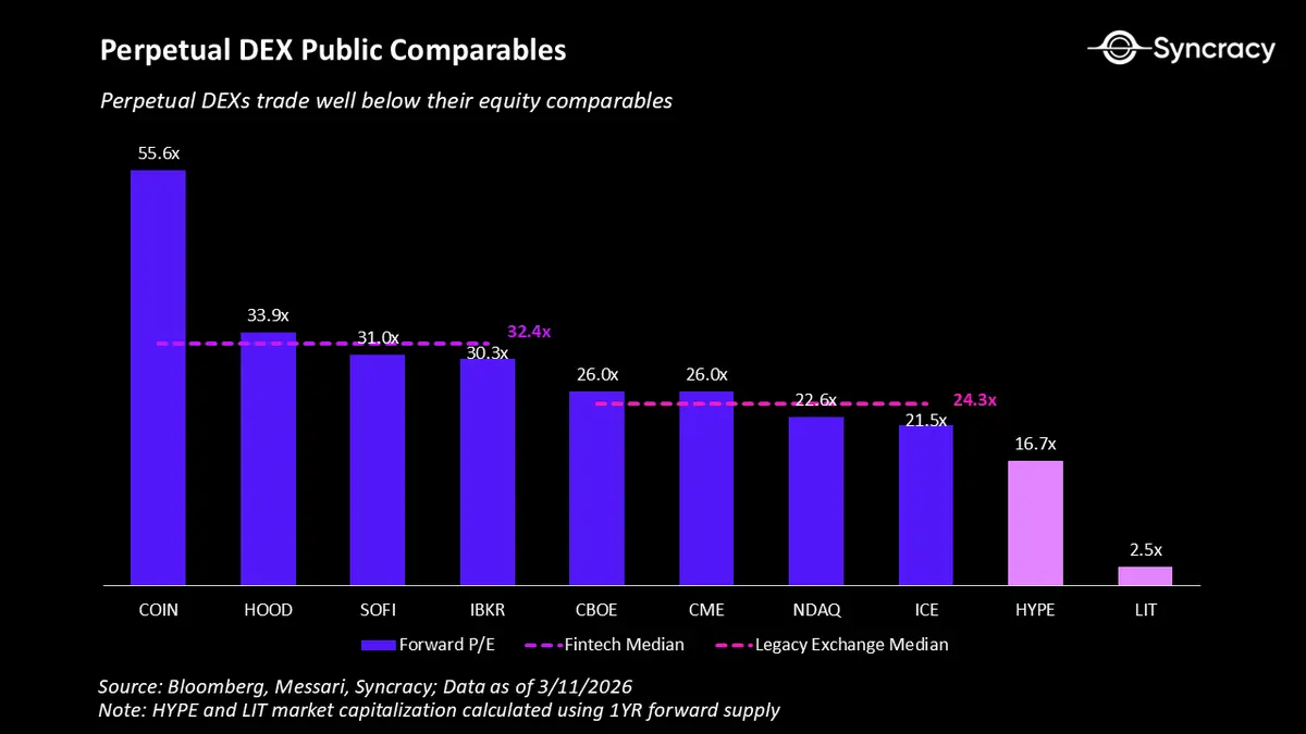 我们认为市场尚未认识到这一潜力,也未认识到去中心化永续交易所长期的竞争力。Hyperliquid和Lighter这两个市场领导者的市盈率分别只有17倍和3倍,这远低于其金融科技和传统交易所同行。下面我们利用上述同行倍数和我们根据上述分析得出的2030年行业利润估计,来量化这个机会。