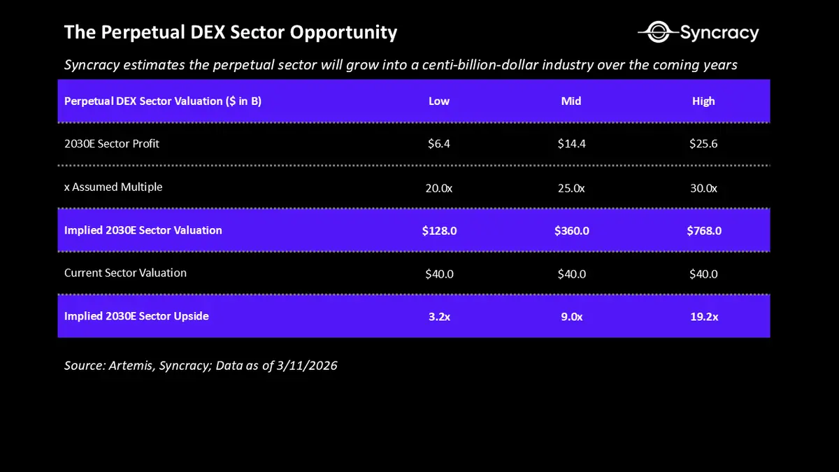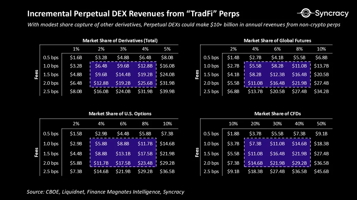 即使只捕获适度的市场份额,其收入影响也是巨大的。上面的表格展示了在全球衍生品市场中,不同可能的手续费率和市场渗透率下的年度费用机会。在1-2个基点的有效费率下,仅仅捕获衍生品交易量的1%就能转化为大约30到70亿美元的年收入。如果市场份额达到2-4%,机会将迅速增长到数百亿美元。请记住,正如上文所述,永续DEX拥有令人难以置信的利润流转能力,因此你可以把这些收入或多或少地视为利润。