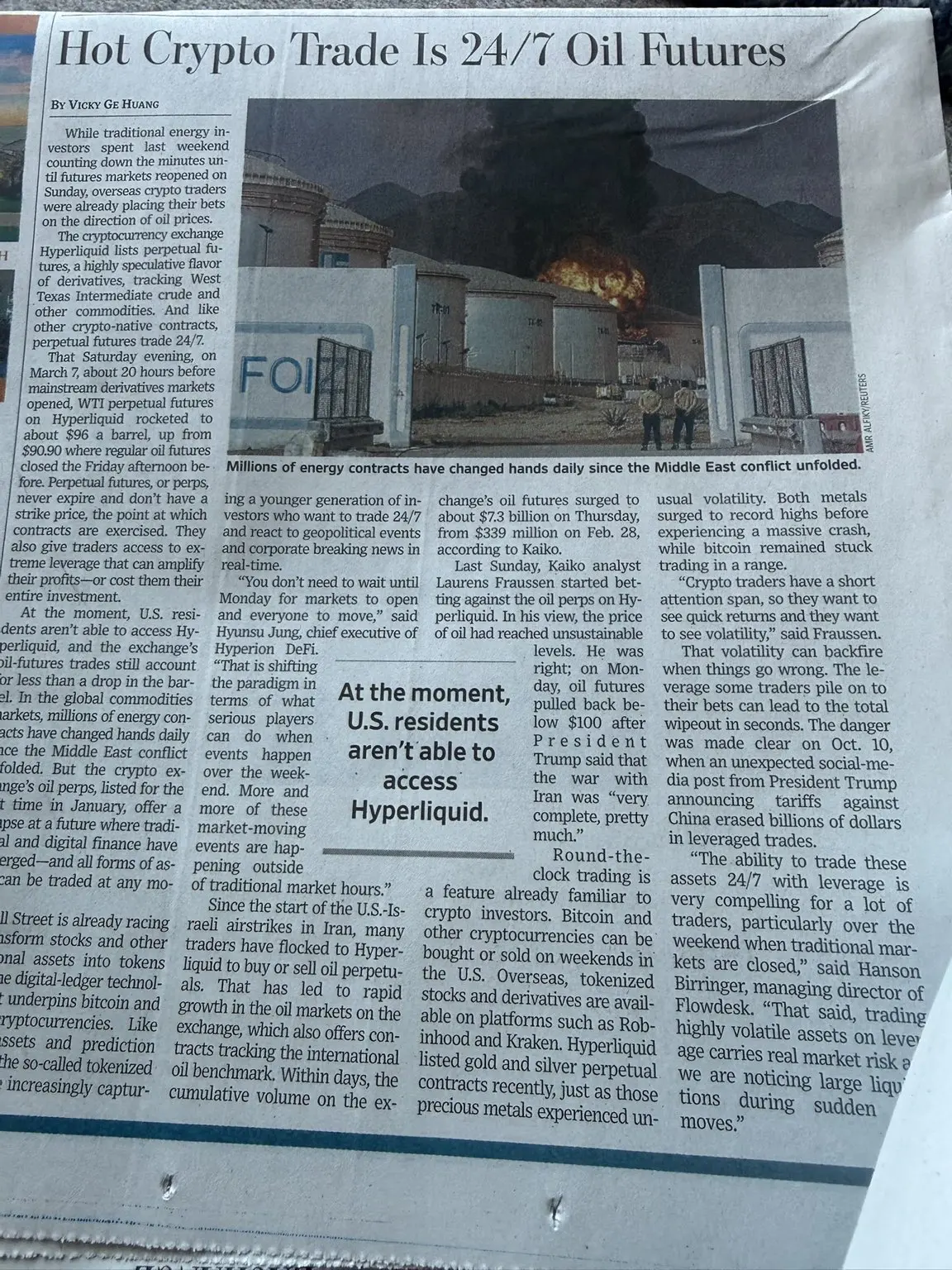 如今,去中心化永续合约交易所可能是地球上唯一能够做到这一点的场所之一。通过提供持续的敞口,它们允许交易者在新闻发生时与其互动,而不受传统市场时间的限制。事实上,这已经不再是理论。就在上个周末,在人们对伊朗冲突极度担忧期间,Hyperliquid促成了超过10亿美元的原油交易。交易员们能够捕捉到从周五收盘到周一开盘期间30%的现货波动,而世界其他地方的散户交易员只能被迫观望。