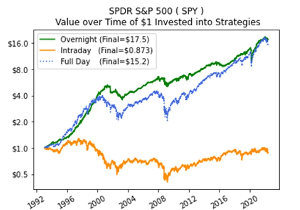在股票市场,研究人员已经证实,受限的交易时间对散户交易者构成了结构性劣势,这主要归因于一种被称为“隔夜漂移”的效应。数据显示,美国股票长期回报中不成比例的份额是在常规交易时间之外产生的,隔夜价格波动占了已实现业绩的很大一部分。