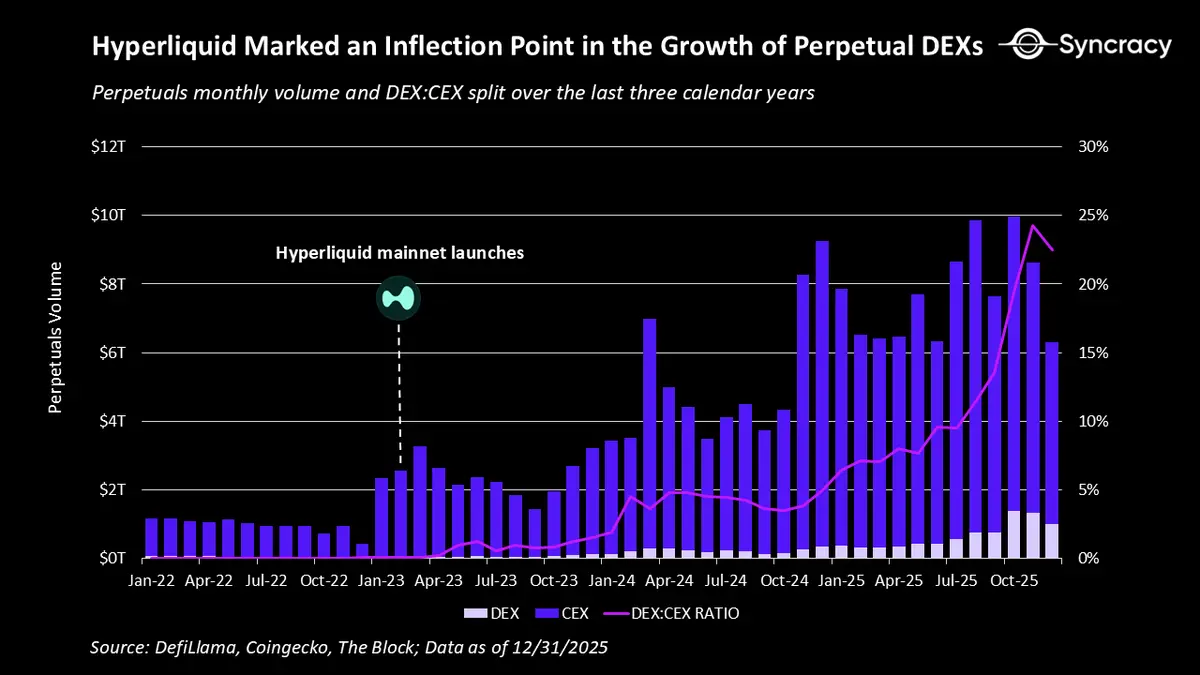 虽然像币安这样的中心化交易所目前以约83%的份额在永续交易量中占据主导地位,但该市场最令人兴奋的演变是去中心化永续交易所的加速增长。
