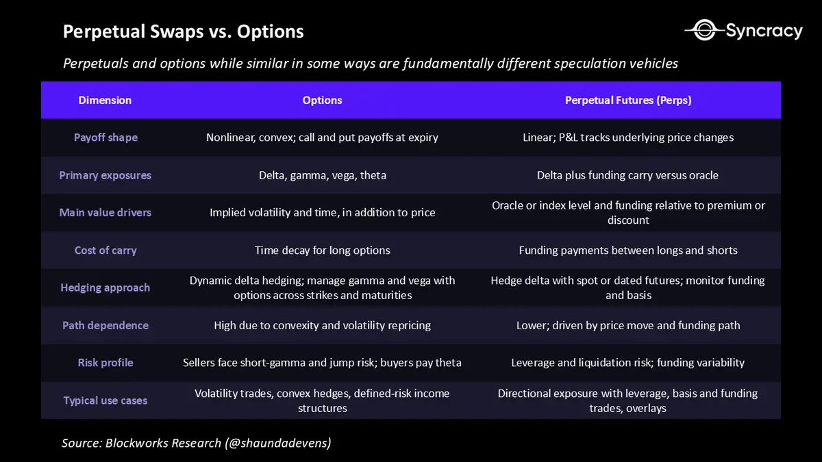 尽管永续合约并不是期权的通用替代品,但我们确实认为它们在不增加复杂性的情况下,更好地捕捉了散户交易者的投机冲动。期权将继续在表达波动率观点、管理尾部风险和构建结构化敞口方面发挥关键作用。其凸性驱动的回报仍然具有吸引力,并且能够在到期前避免清算风险。但这些用例处于大多数散户交易活动发生的核心范围之外。