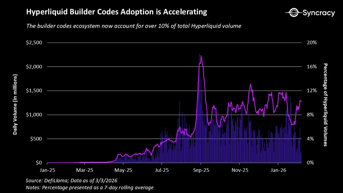 构建者代码确立了一种费用共享机制,为第三方应用程序在后端集成Hyperliquid提供了强大的激励。这在实践中的意义在于:当中心化交易所忙于亲自吸引新的吃单流时,Hyperliquid却有一群前端都在为其争夺流量。增量分发可以像拨动开关一样开启,例如当Phantom在一夜之间引入超过1000万名新交易者时。在未来,这可能意味着一家大型区域交易所用当地语言提供对Hyperliquid的访问,一个受美国监管的经纪商层为Hyperliquid交易者提供更高的杠杆或保护,甚至是一家社交媒体巨头为了提高每用户平均收入而向其用户群引入永续合约。